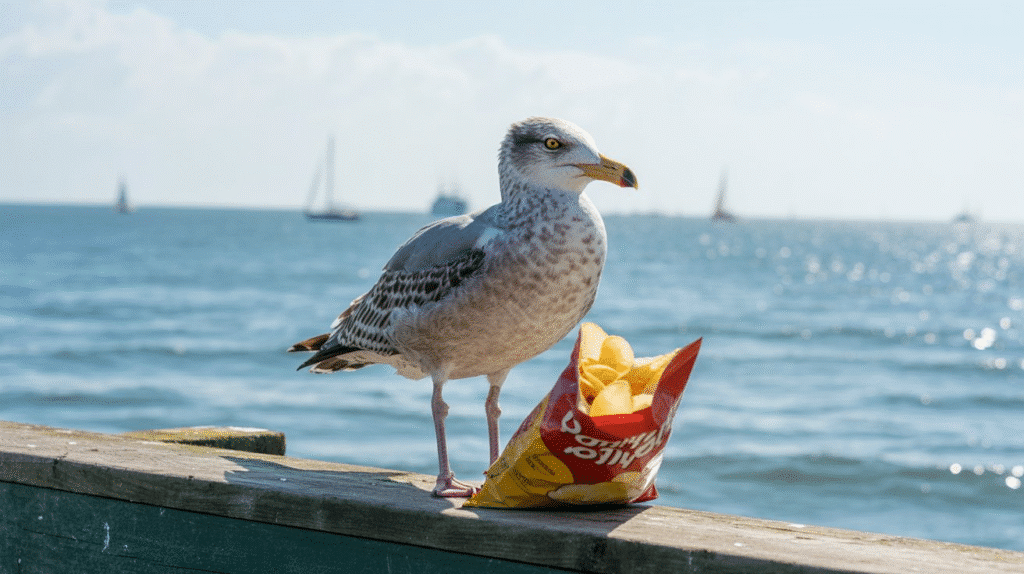 Seagulls are notorious snack thieves. Families laugh later about stolen chips or fries. It’s a universal piece of seagull humor.